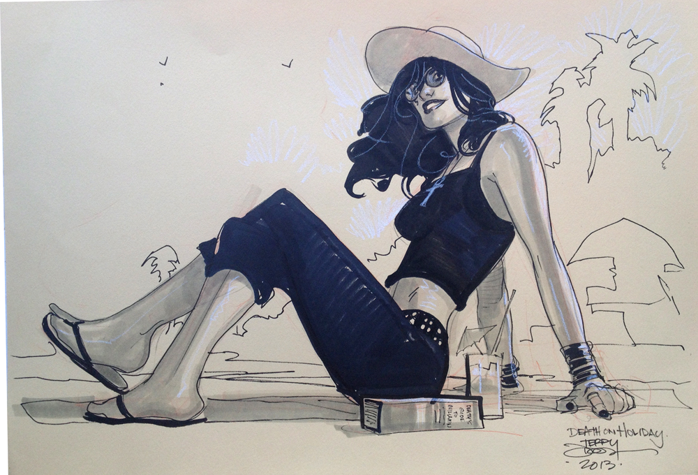 Rachel Dodson then inked the piece, she always starts by "masking off" the area she isn't inking so it doesn't get rubbed or dirty. She usually starts with the faces, for a similar reason - while the pencil line art is at it's highest point of clarity.